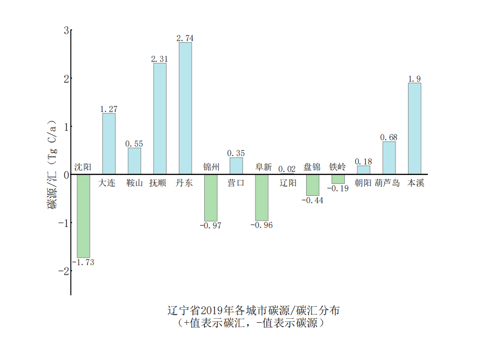宋有涛教授说,在当前陆地生态系统碳循环的相关研究中,经改进的CSF方案是在GPP的基础上扣除自养生物本身呼吸所消耗的同化产物(Ra)和为异养生物呼吸消耗量(Rh),并进一步考虑了人为和自然因素的干扰等非生物呼吸消耗的能量,如生态系统呼吸(ER)、农田碳输出(CRC)、人类返回碳(HC)、活性碳排放(ERC)和水蚀排放(Ewat)等,这是一种更为精确和简洁的碳汇核算方法,可用于区域碳收支的确定、碳源/汇的核算以及定量评估气候因素变化、人类活动对生态系统碳储量影响等。基于该研究方法,经核算辽宁省陆地生态系统(包括森林、农田、草地、湿地、水域等)2019年净固碳5.71Tg C/a(折合2096万吨CO2),其中共吸收碳10.0Tg C/a(3670万吨CO2),释放碳-4.29 Tg C/a(1574万吨CO2)。从空间格局分布上来看,碳汇地区多分布于辽东主要以林地为主的地区,碳汇区单位面积固碳量最高值到达414.97 gCm-2a-1,而作为主要以耕地为主的辽中地区以及辽西南地区多为碳源区,最低值为-218.52 gCm-2a-1,这说明在去除各种人为和自然因素等干扰后,森林生态系统仍然是陆地生态系统中最大的碳库。从各地级市排行来看,丹东市(2.74Tg C/a)、抚顺市(2.31Tg C/a)、本溪市(1.90Tg C/a)和大连市(1.27Tg C/a)位居辽宁省碳汇区的前四名,而沈阳市(-1.73Tg C/a)、锦州市(-0.97Tg C/a)、阜新市(-0.96Tg C/a)、盘锦市(-0.44 Tg C/a)以及铁岭市(-0.19 TgC/a)为辽宁省的碳源区。